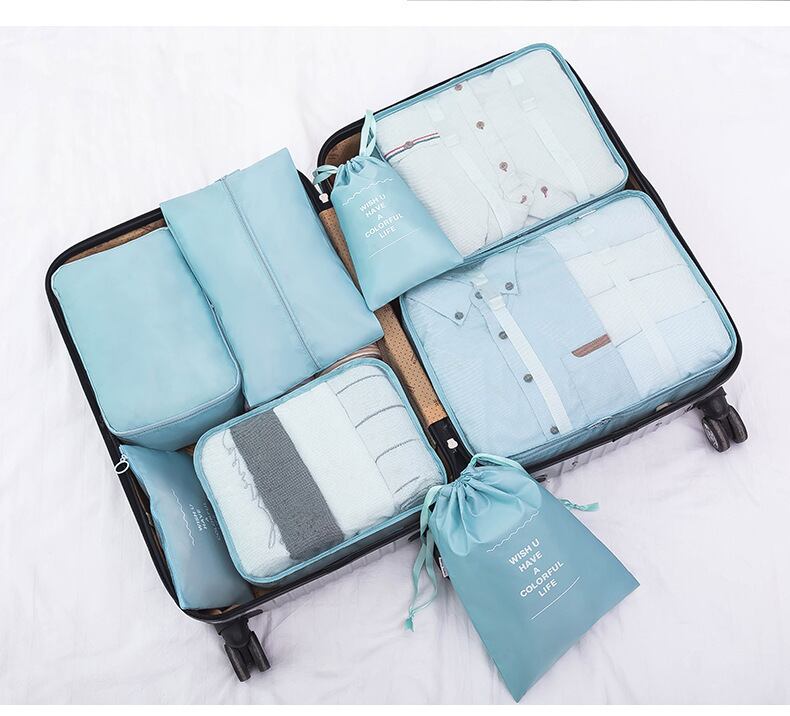 セット内容:衣類用キューブ(複数サイズ)、下着ポーチ、洗面用具ポーチ、シューズバッグ、巾着袋、その他小物ポーチなど計8点