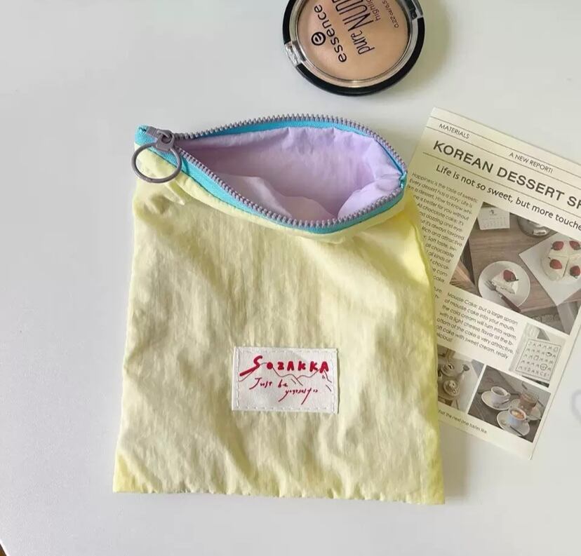 バッグの中の小物やコスメを整理するのにぴったり!おしゃれなパステルイエローとバイカラーのファスナーの組み合わせが目を引く、スタイリッシュなフラットポーチが登場です。
