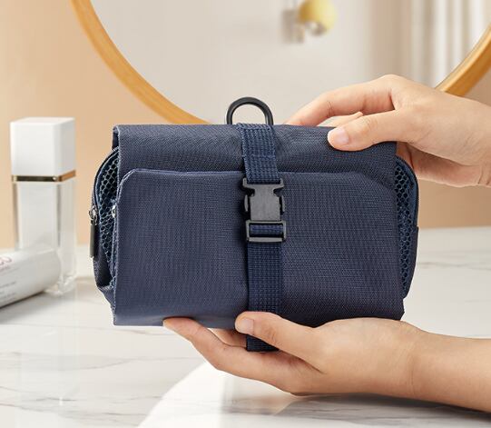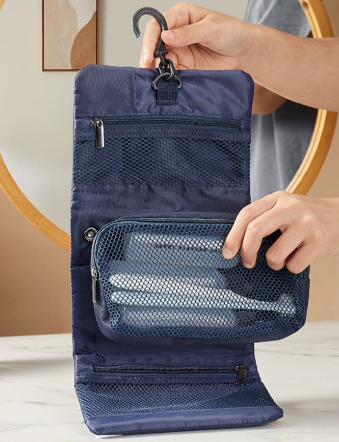 ロール状から広げると、多数のポケットと仕切りが出現。化粧品やスキンケア用品、歯ブラシなどの小物をしっかりと整理できます。メッシュポケットもあり、中身の確認も簡単。
