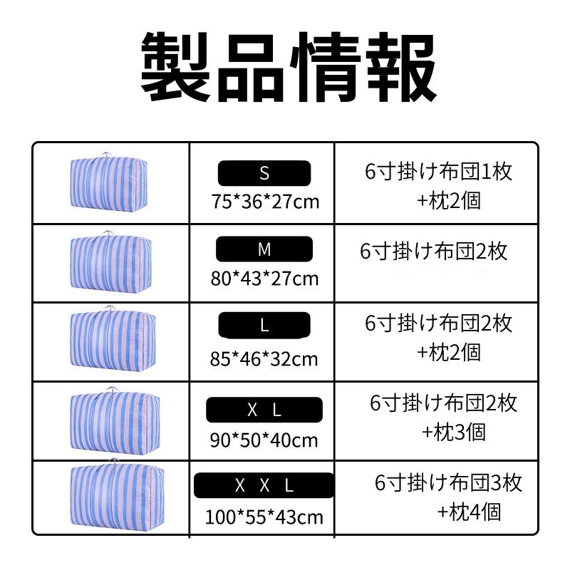 このバッグは、6寸掛け布団を3枚と枕を4個収納できる大容量が魅力です。旅行や引越しの際、必要なものをすっきりとまとめることができ、使い勝手は抜群です!たくさんの荷物を持って移動する際に最適なアイテムです。