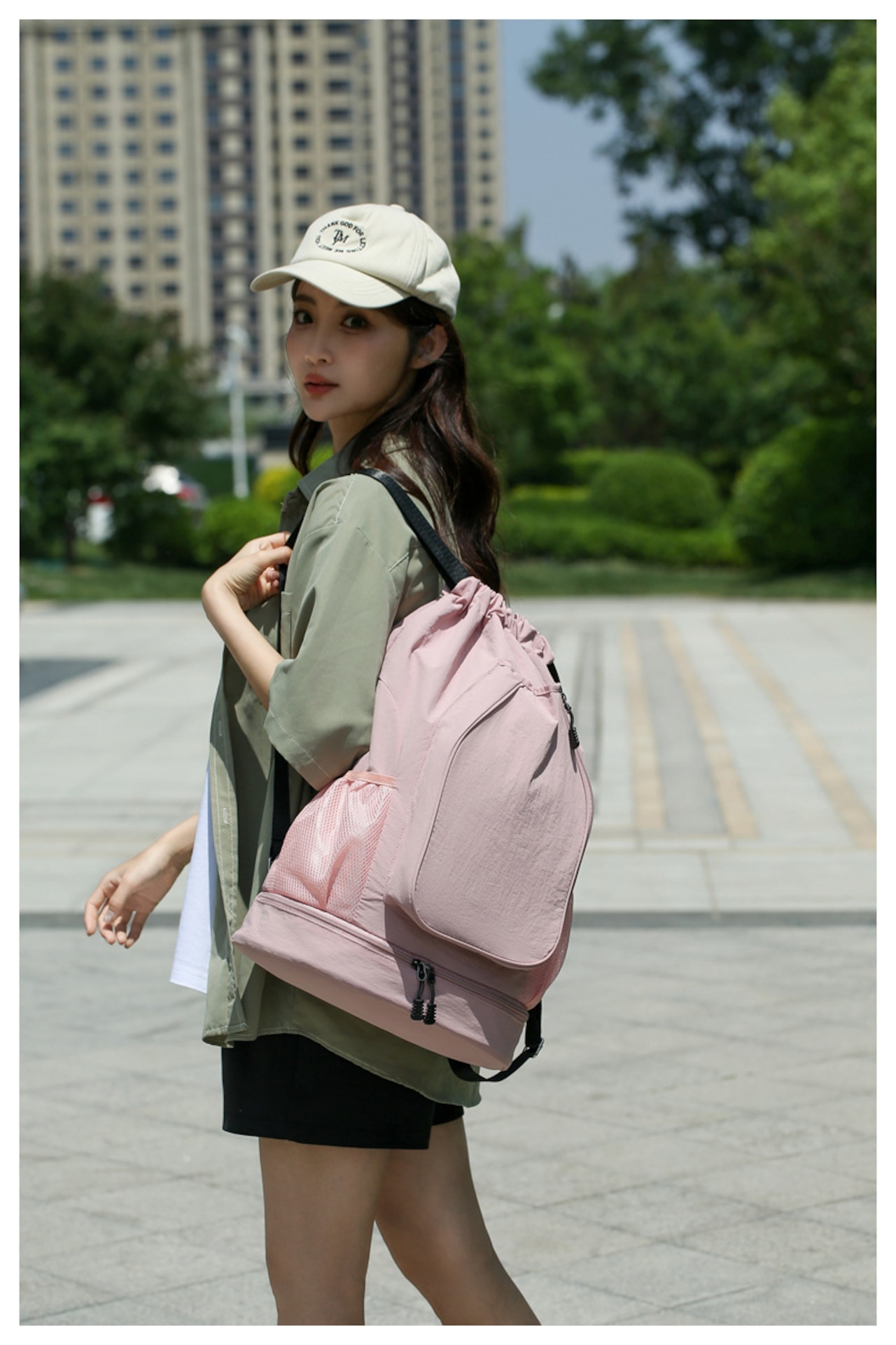 このペールピンクの2層式ジムバッグは、温泉、出張、ジム、週末のお出かけなど、さまざまなシーンでご活躍いただけます!フレキシブルにサイズを変えて収納できるため、旅行中の荷物もスムーズに管理できます。アクティブなライフスタイルをしっかりと支えてくれる頼もしいパートナーです。