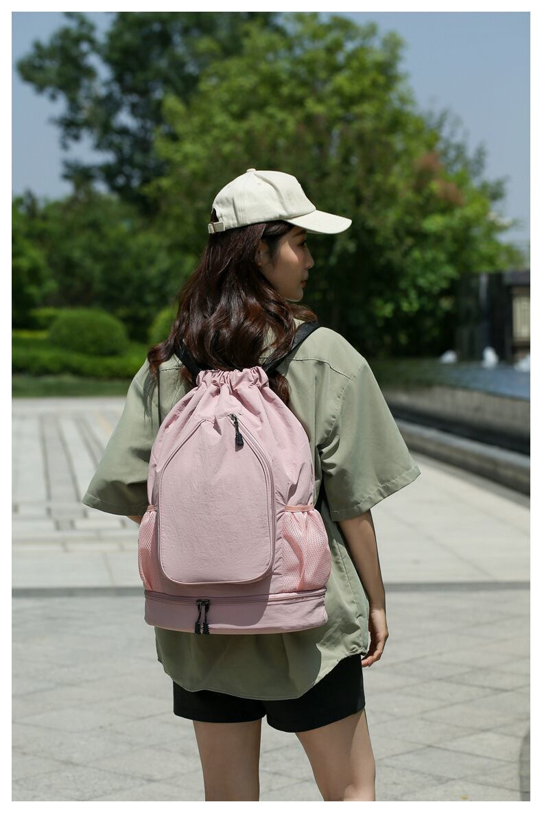 この2層式ジムバッグの最大の特長は、清楚で可愛らしいペールピンクのデザインと、2つの収納スペースによる高い機能性です!上部のメインコンパートメントには衣類やタオル、下部にはシューズや濡れたアイテムを分けて収納でき、効率的な整理を実現します。軽量設計で、持ち運びも快適です!