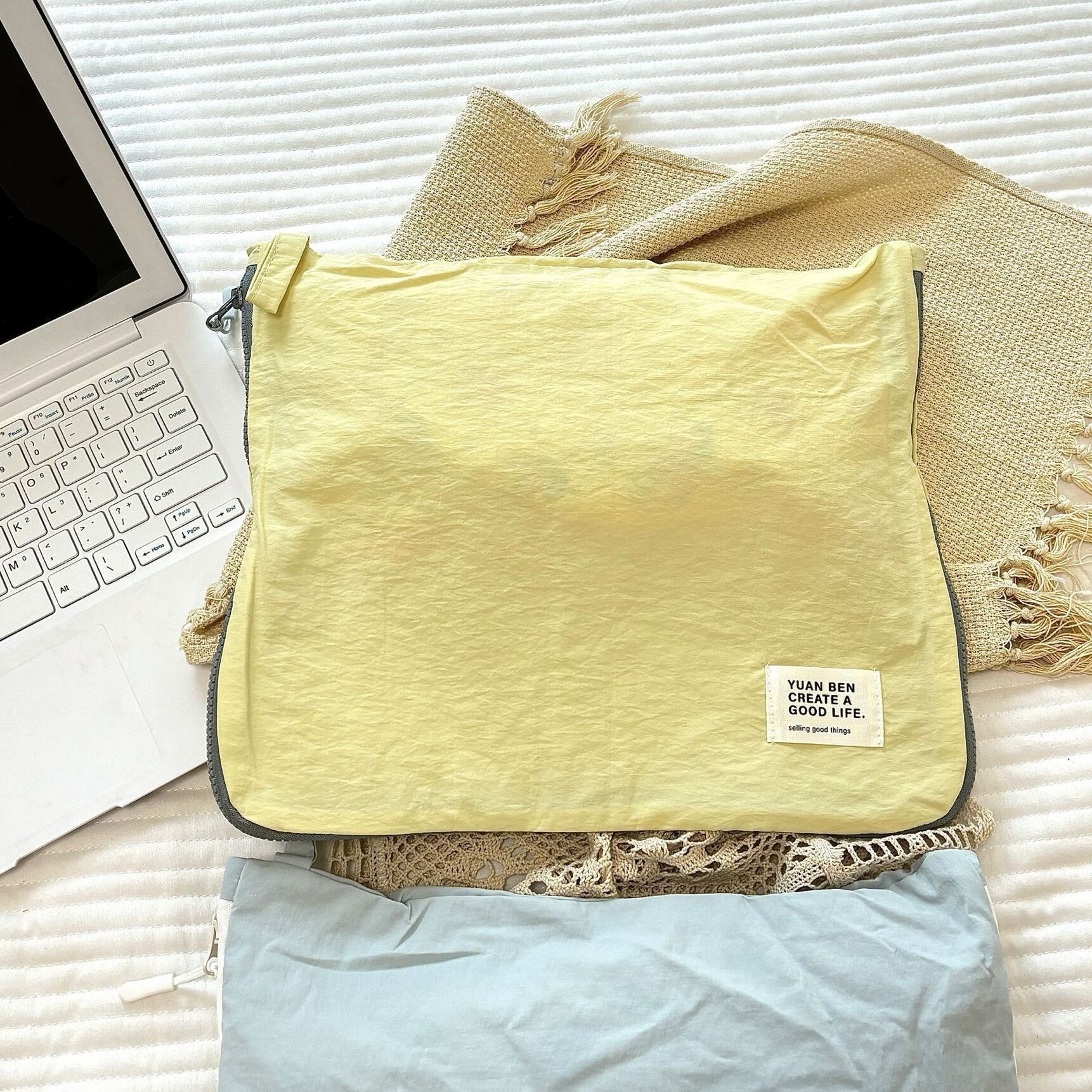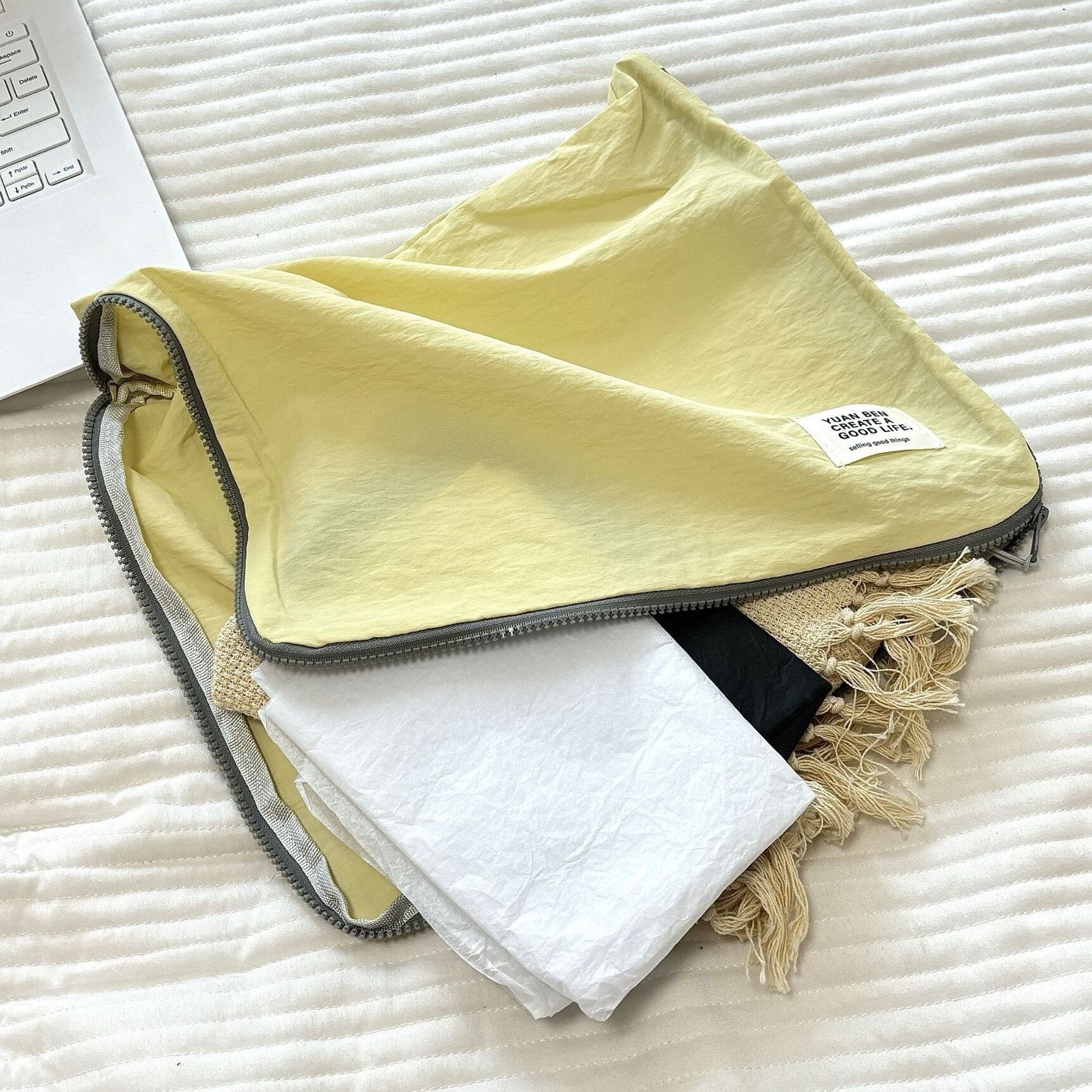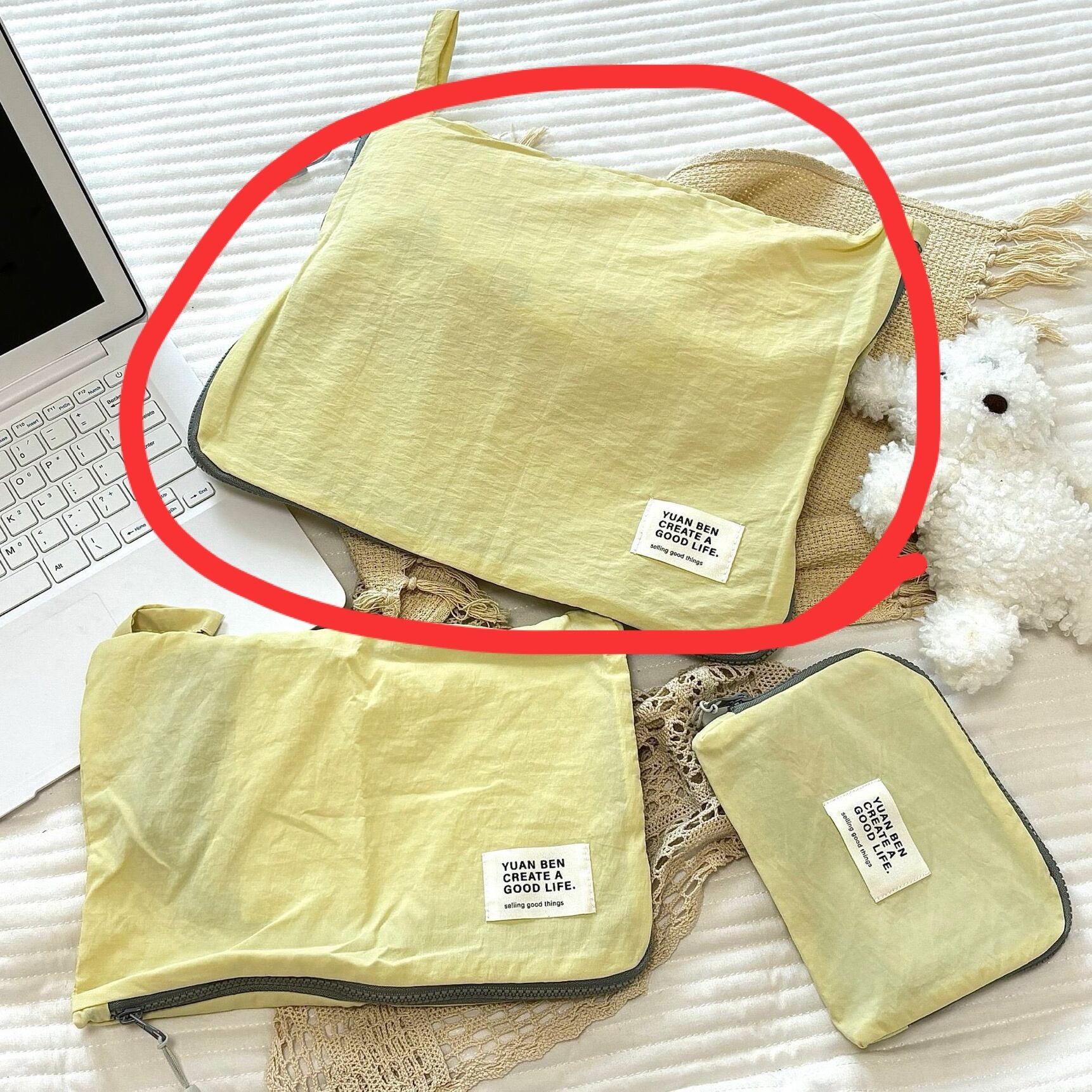 新登場の「旅行用パッキングポーチ」は、36×30cmの大きさでセーターやパーカーなどの大きめの衣類もすっきりと収納できる便利なアイテムです!鮮やかなレモンイエローが、旅の準備を楽しくしてくれ、スーツケースの中をおしゃれに整えてくれます。このポーチを使うことで、必要な衣類を簡単に整理でき、旅行がますます楽しくなります。