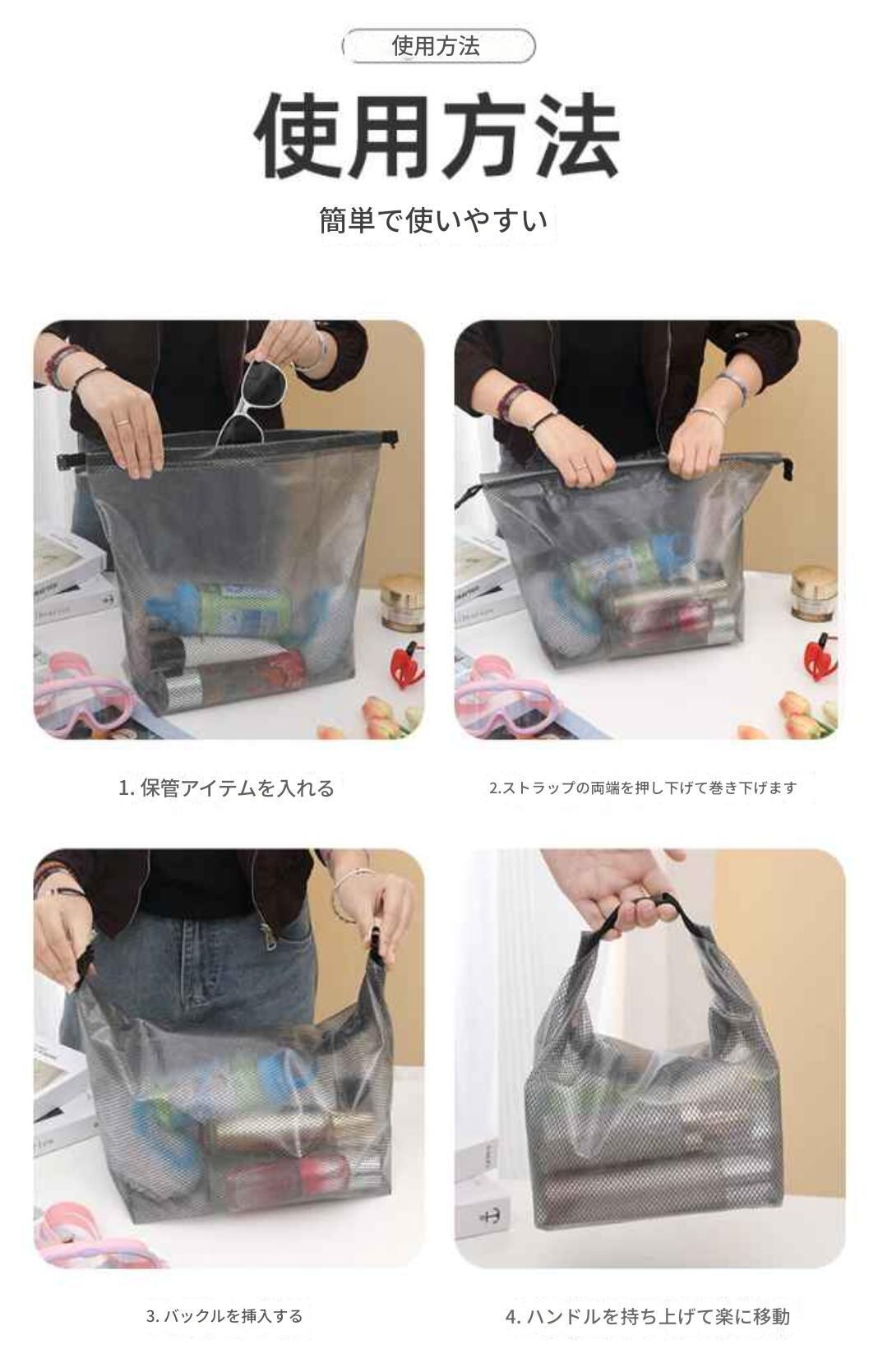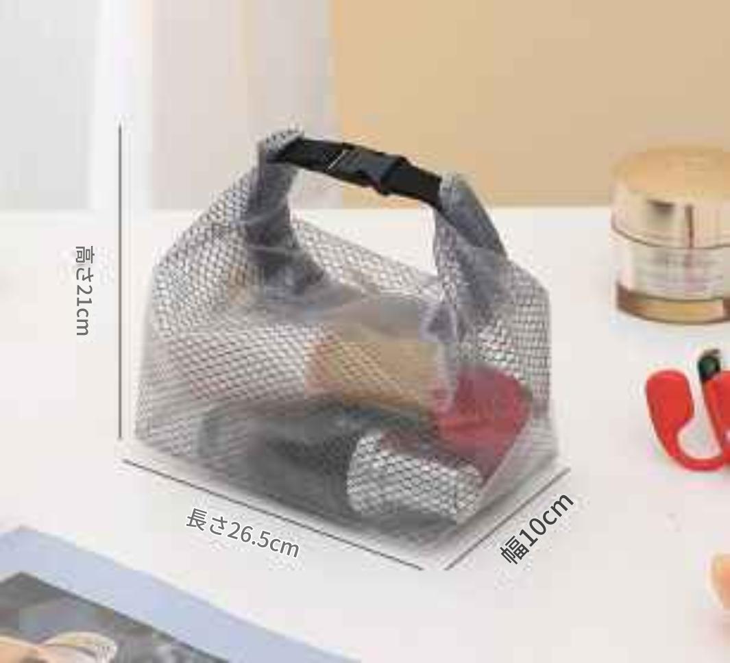 このメッシュ素材の防水バッグは、旅行の際はもちろん、プールやジム、キャンプなど多くのシーンで大活躍します!その機能的なデザインが、あなたのライフスタイルにぴったり寄り添い、大切なアイテムを整理して収納します。ぜひ、お手に取ってその使い勝手を実感してください。