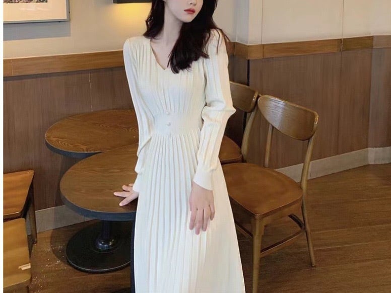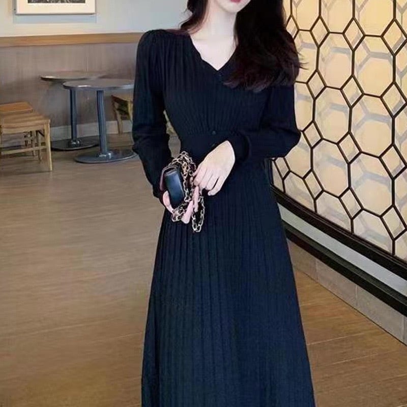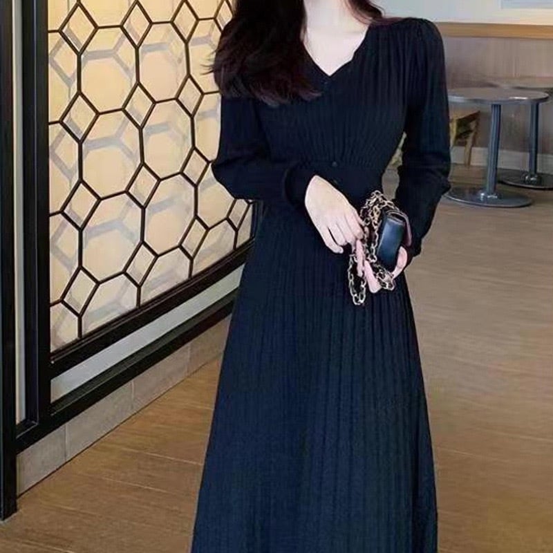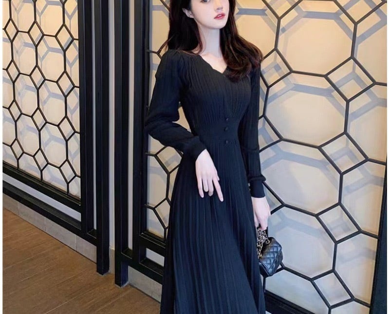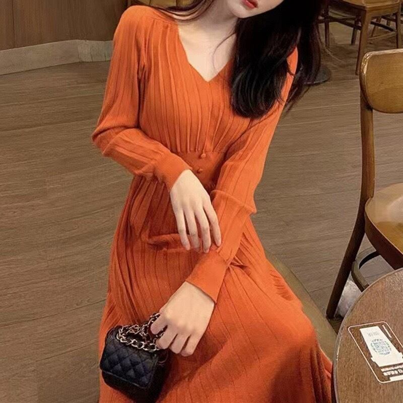 【高伸縮性・着痩せAライン】きれいめVネックニットワンピース 秋冬 ロング丈 プリーツスカート 上品 オフィス/旅行に最適 黒/白/オレンジ